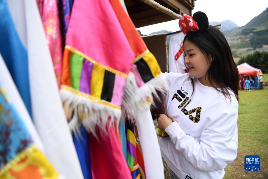 一名游客在扎尕那景區(qū)挑選藏族服飾體驗民族風情(8月28日攝)。新華社記者 杜哲宇 攝
