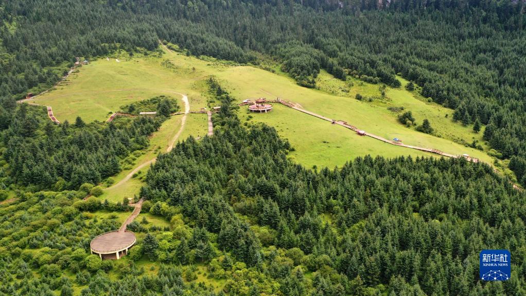 游客行走在扎尕那景區(qū)的木棧道上(8月28日攝,無人機照片)。新華社記者 杜哲宇 攝