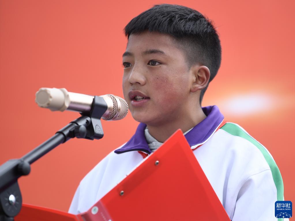 9月1日,在位于果洛藏族自治州瑪沁縣的瑪多地震災(zāi)后過渡安置一校區(qū),學生科熱在國旗下講話。新華社記者 張龍 攝
