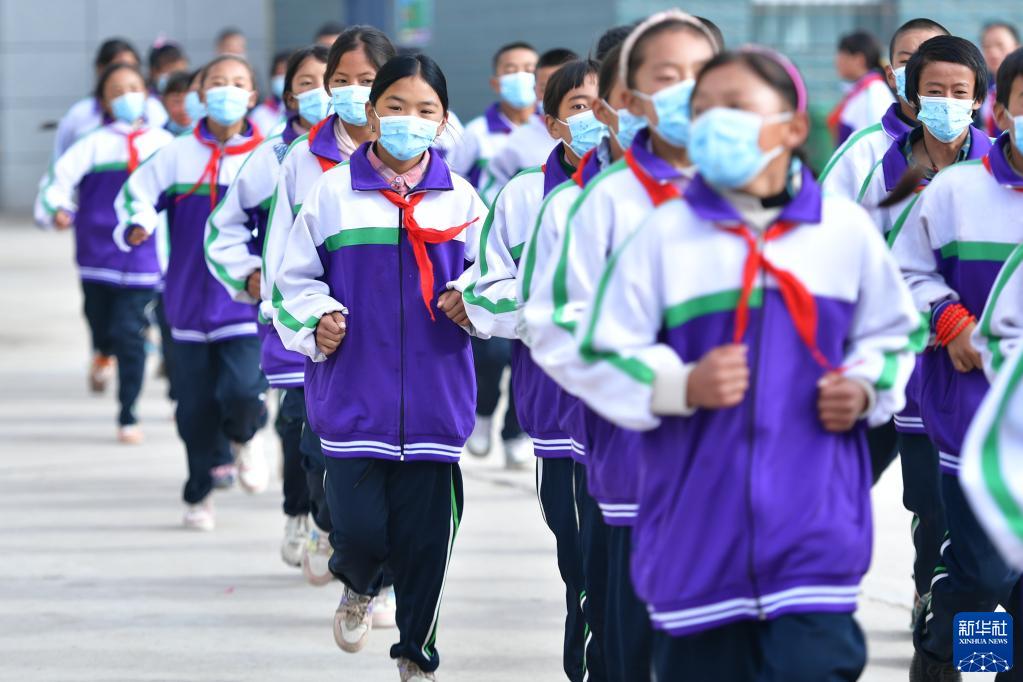 9月1日,在位于果洛藏族自治州瑪沁縣的瑪多地震災(zāi)后過渡安置一校區(qū),學生在跑步。新華社記者 張龍 攝
