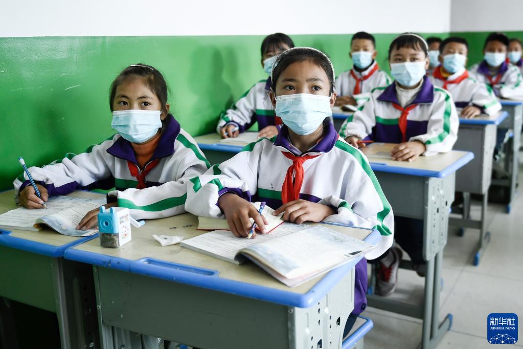 9月1日,在位于果洛藏族自治州瑪沁縣的瑪多地震災(zāi)后過渡安置一校區(qū),學生在上開學第一課。新華社記者 張龍 攝
