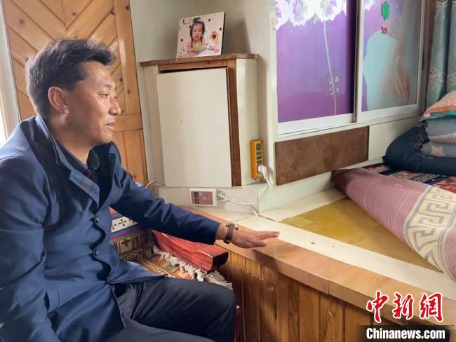 圖為合作市堅(jiān)木克爾街道黨工委書記阿黑介紹村民家的碳纖維電熱炕板。 宋子昕 攝