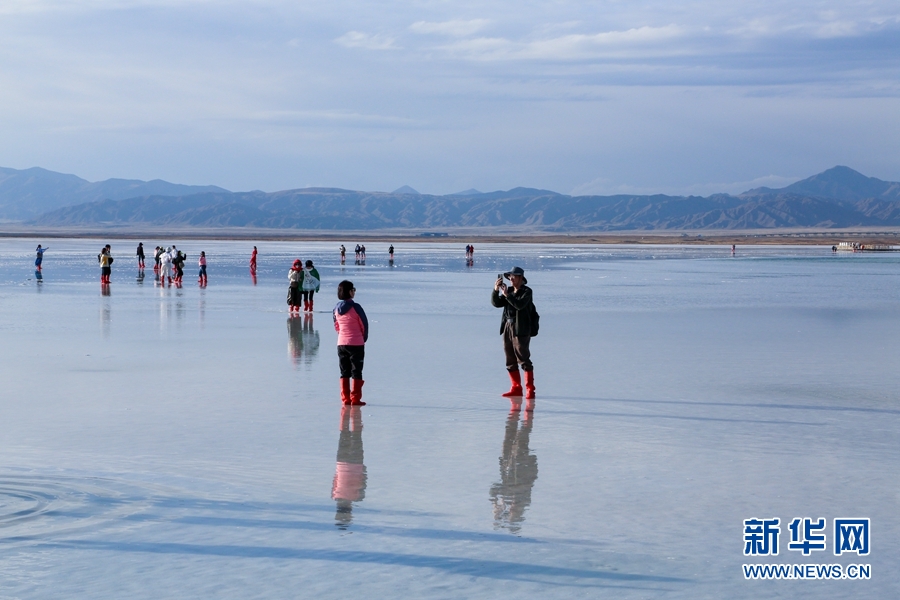 游客在茶卡鹽湖“天空之鏡”景區(qū)游玩。新華網(wǎng) 卡婭梅朵 攝