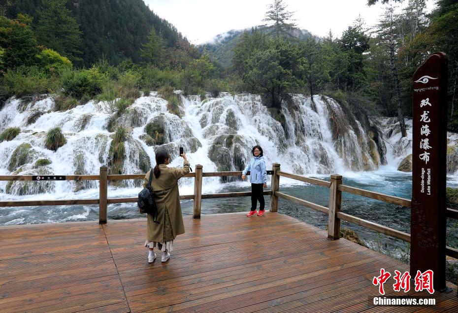 9月27日,四川阿壩,游客在九寨溝景區(qū)雙龍海瀑布前拍照。王磊 攝
