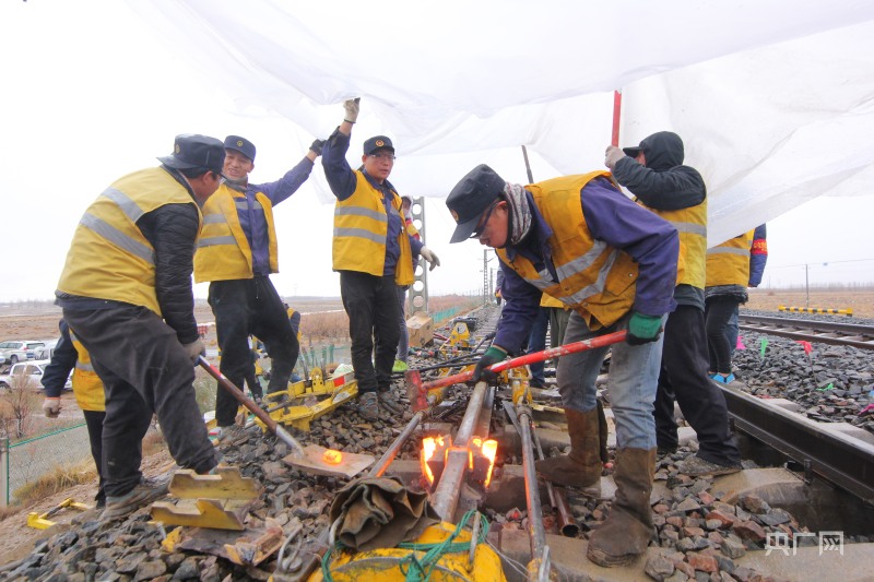 但這還不夠,為了讓鋼軌充分舒放“筋骨”、釋放應(yīng)力,職工們還必須切開鋼軌,緊接著進(jìn)行焊聯(lián),這項(xiàng)工作由德令哈重點(diǎn)維修車間負(fù)責(zé)。車間主任郭鋒亮一邊組織職工開動(dòng)切割機(jī)實(shí)施精準(zhǔn)切割,一邊組織職工架起焊鍋?;鸹w舞,火苗竄升,作業(yè)人員的對(duì)比服在火光和風(fēng)雪的映襯下顯得更加熠熠生輝。最終,做完“伸展運(yùn)動(dòng)”的鋼軌在焊劑的作用下重新融合在了一起,經(jīng)打磨后再難區(qū)分彼此。