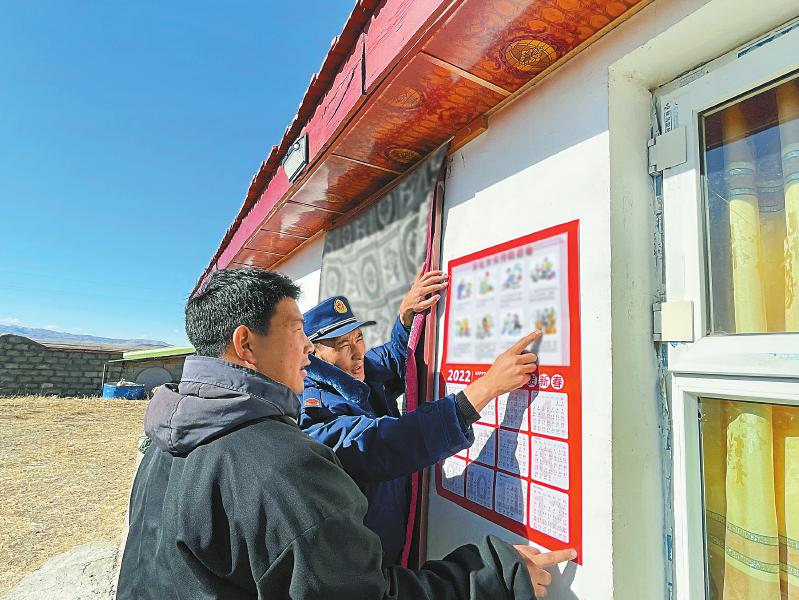 索郎更波(右)給牧民講解牧區(qū)消防知識。 阿壩州消防救援支隊(duì)供圖