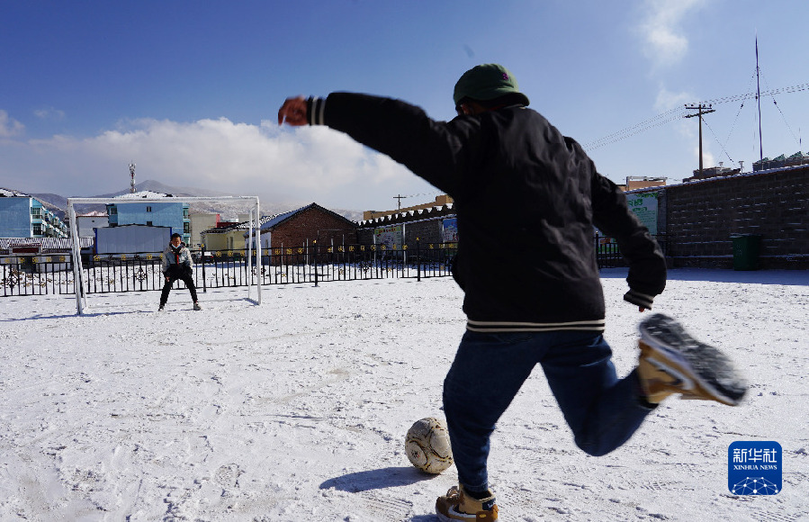 上午10時(shí)許,雪花紛紛揚(yáng)揚(yáng),已布滿積雪的操場(chǎng)站滿了學(xué)生。歡快的音樂(lè)中,大家跳起鍋莊舞,臉上洋溢著純真的笑容。學(xué)生身上嶄新的橙黃色羽絨服,在陽(yáng)光下、雪地里分外顯眼。