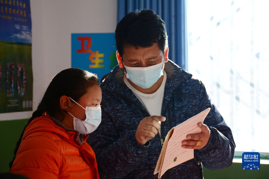 在青海省果洛藏族自治州瑪多縣地震災(zāi)后過(guò)渡安置一校區(qū)五年級(jí)二班,教師者才(右)在課堂上為學(xué)生輔導(dǎo)作業(yè)(12月18日攝)。