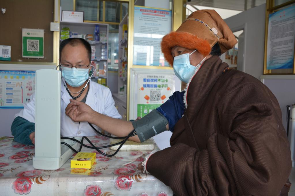 在青海省果洛藏族自治州瑪多縣的復(fù)康診所內(nèi),醫(yī)生正在給當(dāng)?shù)鼐用袢章辶垦獕?。柳澤興 攝
