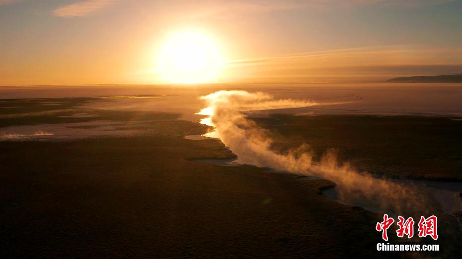 在冬日晨曦,初升的暖陽下黑馬河水汽升騰,成群的大天鵝宛如仙子沐浴出水,畫面唯美。馬海青 攝