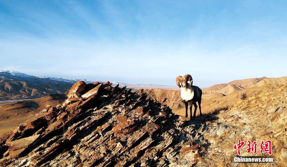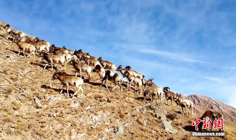近日,攝影愛好者在地處柴達(dá)木盆地的青海省海西州都蘭縣香加鄉(xiāng)山區(qū)拍到成群盤羊。