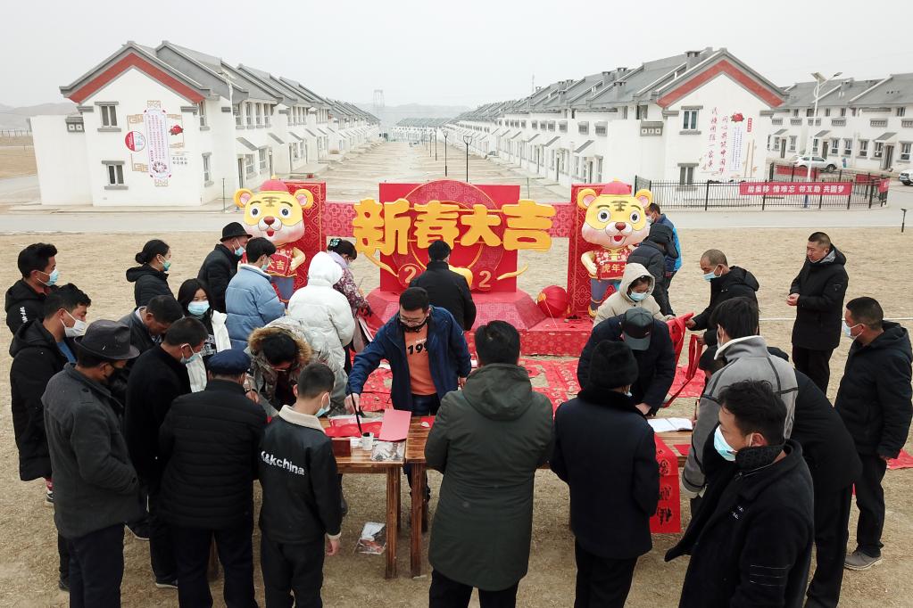 1月25日,在蘭州新區(qū)舟曲避險搬遷安置點,舟曲地質災害避險搬遷第一臨時黨支部組織書法家給搬遷群眾送春聯。新華社記者 范培珅 攝