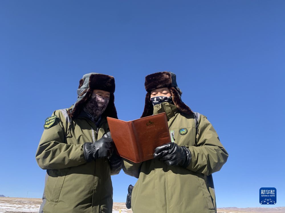 2021年12月3日,祁連山國家公園沙龍灘管護站巡護隊隊長楊有財(左)在巡護監(jiān)測記錄手冊上記錄。新華社 李琳海 攝