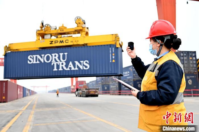 圖為周祖瑾對中歐班列集裝箱裝卸作業(yè)進行安全監(jiān)控。鄧文鑫 攝