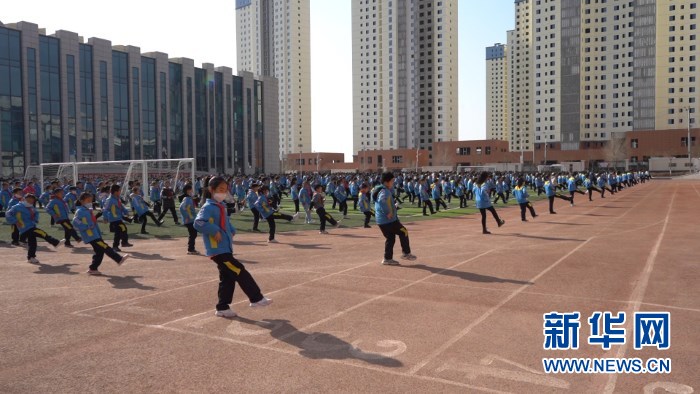 22日,蘭州新區(qū)第二小學(xué)學(xué)生們在操場上做課間操。新華社記者 王紫軒 攝