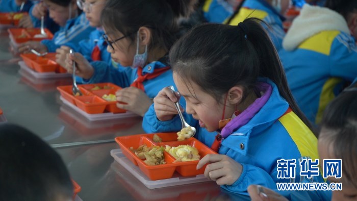22日,尚欣怡和同學(xué)們在食堂吃午飯。新華社記者 王紫軒 攝