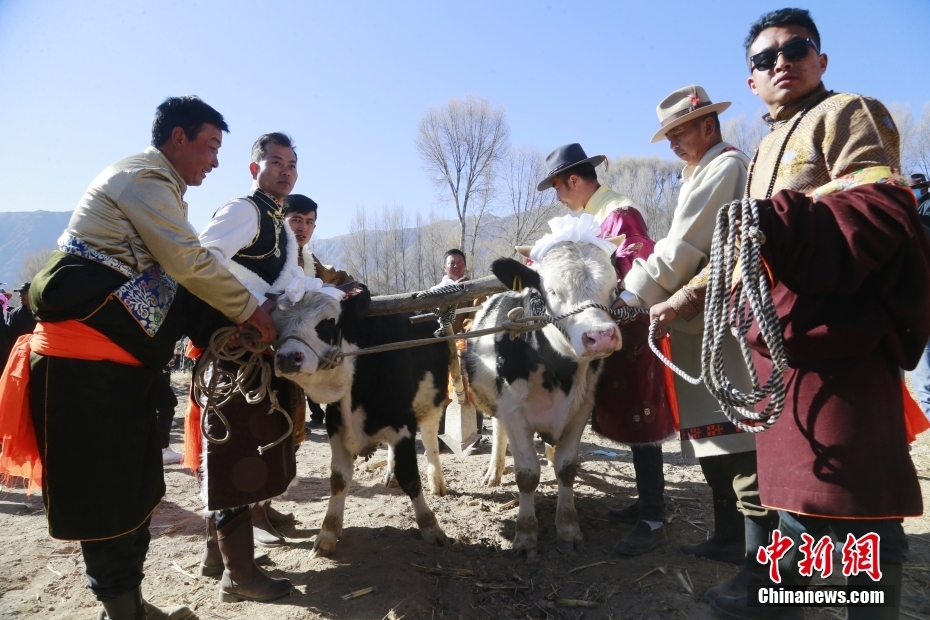 2月24日,藏族民眾用“二牛抬杠”的傳統(tǒng)方式開啟新春第一犁。中新社記者 馬銘言 攝