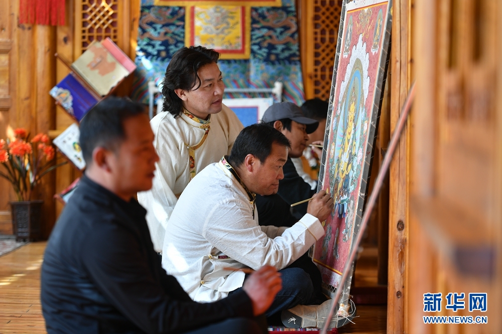 作為熱貢藝術(shù)傳承人及致富帶頭人,格桑嘉措2013年創(chuàng)辦了格桑熱貢藝術(shù)傳播中心,在自己居住的四合院中設(shè)立唐卡展廳,收徒辦學(xué),累計(jì)培養(yǎng)熱貢藝人30多人。圖為格桑嘉措的徒弟達(dá)巴在繪制唐卡。