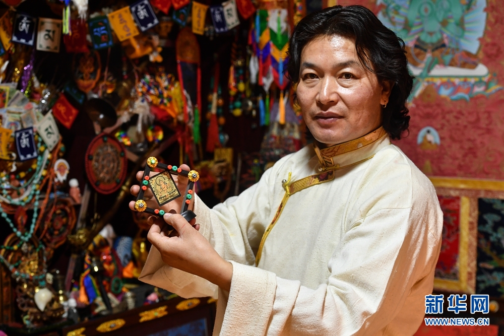 同仁市“脫貧攻堅(jiān)社會(huì)扶貧先進(jìn)個(gè)人”、黃南州“優(yōu)秀共產(chǎn)黨員”、青海省“綠色家庭示范戶(hù)”……近年來(lái),格桑嘉措不僅通過(guò)自己的努力,帶動(dòng)當(dāng)?shù)刎毨?hù)就地創(chuàng)業(yè),還積極投身各項(xiàng)公益活動(dòng)中,自2014年至今,已累計(jì)捐款捐物72萬(wàn)元。圖為格桑嘉措在唐卡展廳內(nèi)整理他創(chuàng)作的文創(chuàng)產(chǎn)品。