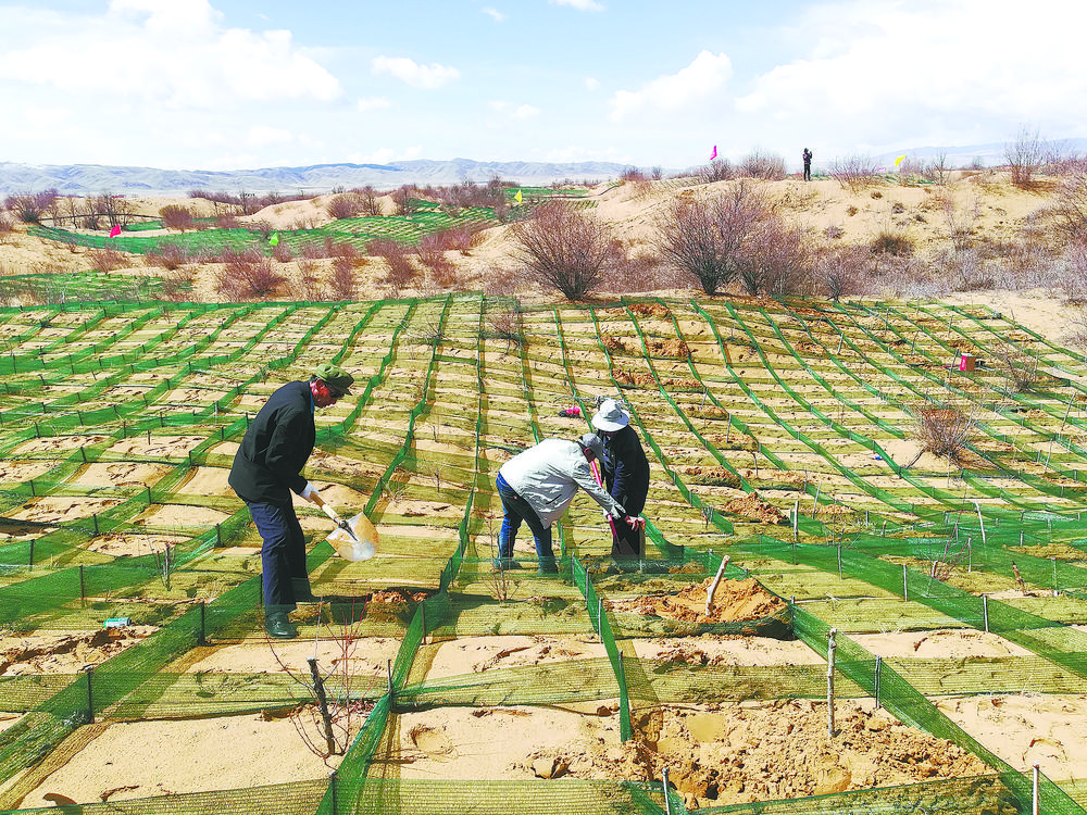 陶銳說(shuō):“比如在流動(dòng)半流動(dòng)沙丘,我們將工程固沙與生物治沙相結(jié)合。在迎風(fēng)面設(shè)置1.5m×1.5m的草方格沙障,在設(shè)置好的草方格沙障內(nèi)栽植青楊,進(jìn)行烏柳插桿并點(diǎn)播檸條沙蒿等,而在背風(fēng)坡實(shí)行插桿造林。在丘間地,我們則采取植苗造林,栽植烏柳苗和沙棘苗,并用網(wǎng)圍欄進(jìn)行封育等?!?/p>