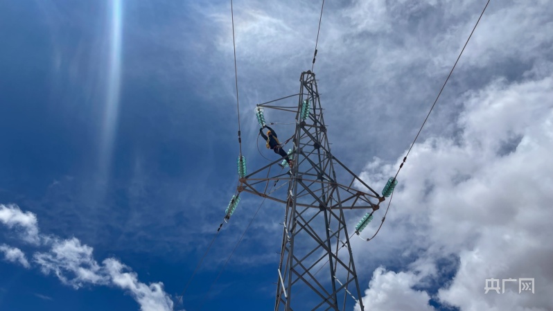 電力線路工在18米鐵塔檢修懸式絕緣設備(央廣網發(fā) 周賀 攝)