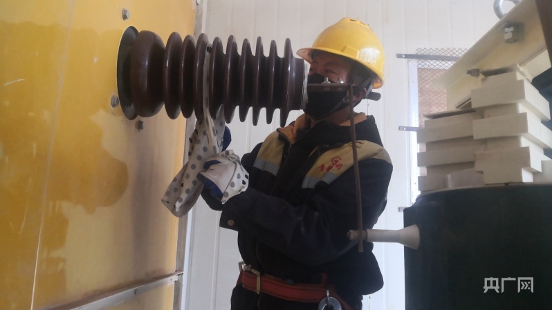 電力線路工在清洗絕緣設備(央廣網發(fā) 周賀 攝)