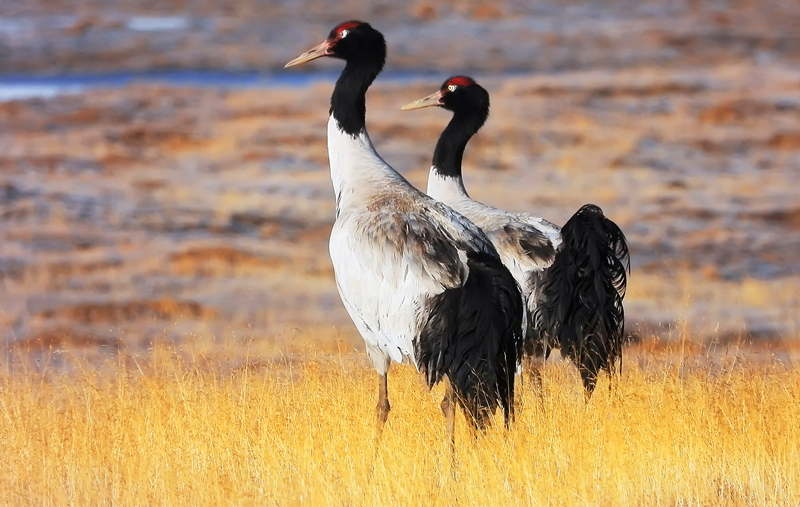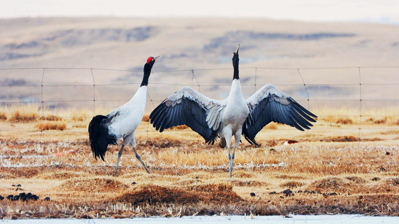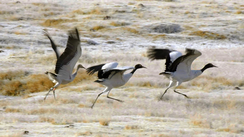 黑頸鶴驅(qū)逐闖入領(lǐng)地的其他鳥類。張景元 攝