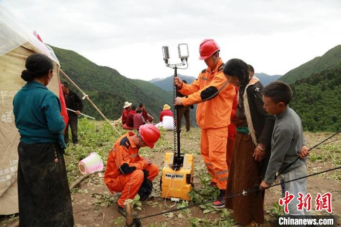 震中草登鄉(xiāng)斯拉爾底村三組安置點電力搶險人員架起照明設備,最后一個停電的受災村莊燈亮了。張懿玲 攝