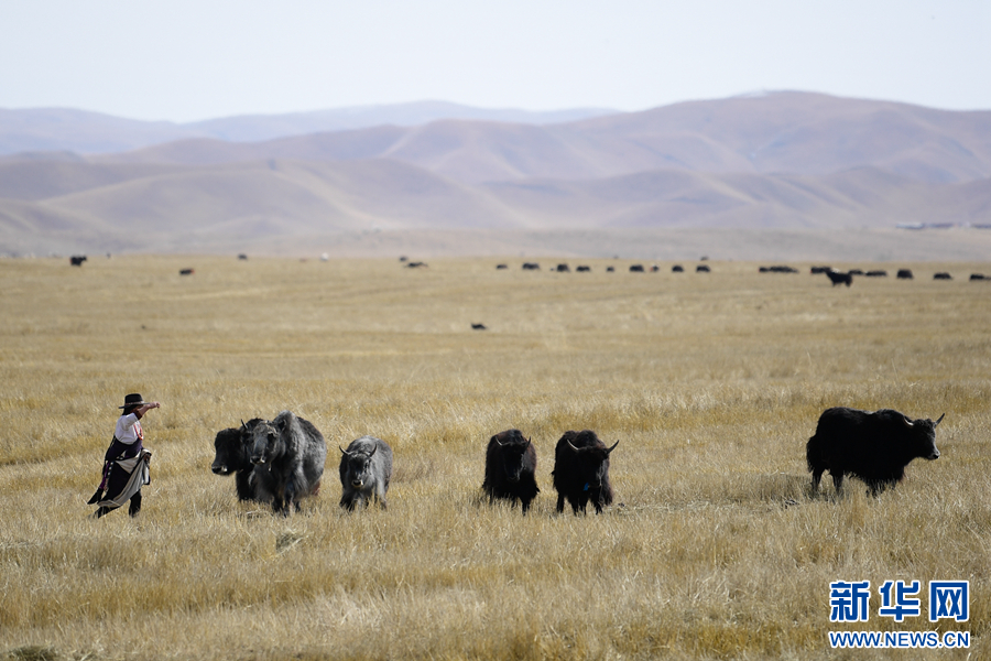 秋日時(shí)節(jié),在黃南州澤庫縣寧秀鄉(xiāng),當(dāng)?shù)啬撩裨诓菰戏拍?。新華社記者 張龍 攝
