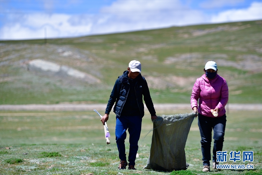 果洛州瑪多縣瑪查理鎮(zhèn)噶丹村,生態(tài)管護(hù)員在村子周邊的草原上撿拾垃圾。(資料照片)新華社記者 張龍 攝