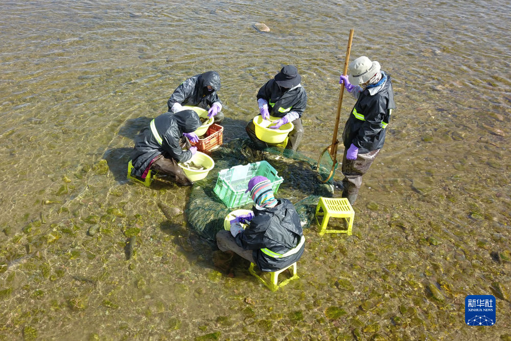 6月29日,在泉吉河河道中,工作人員捕撈親魚(yú)(無(wú)人機(jī)照片)。新華社記者 范培珅 攝