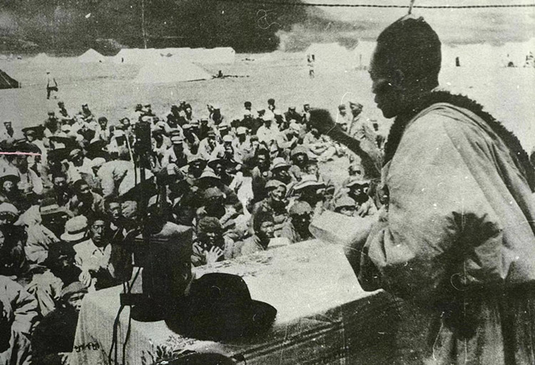 圖為1952年8月工作團在達日縣查郎寺召開果洛頭人、代表聯(lián)誼會議,扎喜旺徐團長在聯(lián)誼會議上作有關(guān)民族團結(jié)的報告。圖片由央金提供
