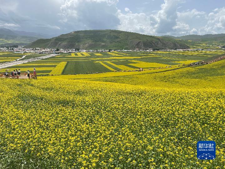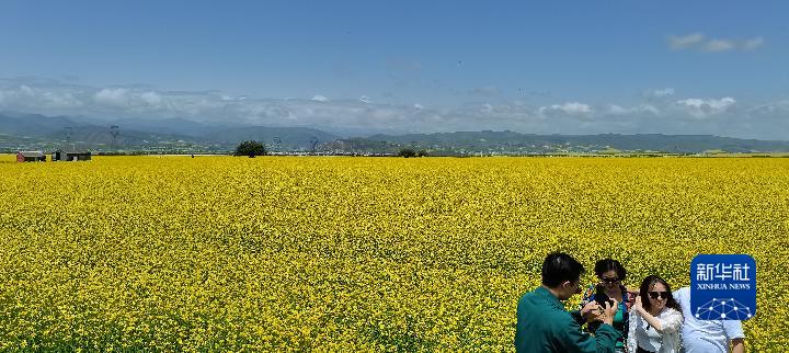 盛夏時(shí)節(jié),從青海省會西寧出發(fā),沿張汶高速公路驅(qū)車1個(gè)多小時(shí),就進(jìn)入門源回族自治縣境內(nèi)。油菜花鋪展出“金色花?!保斓亻g融為一幅濃墨重彩的天然畫卷。