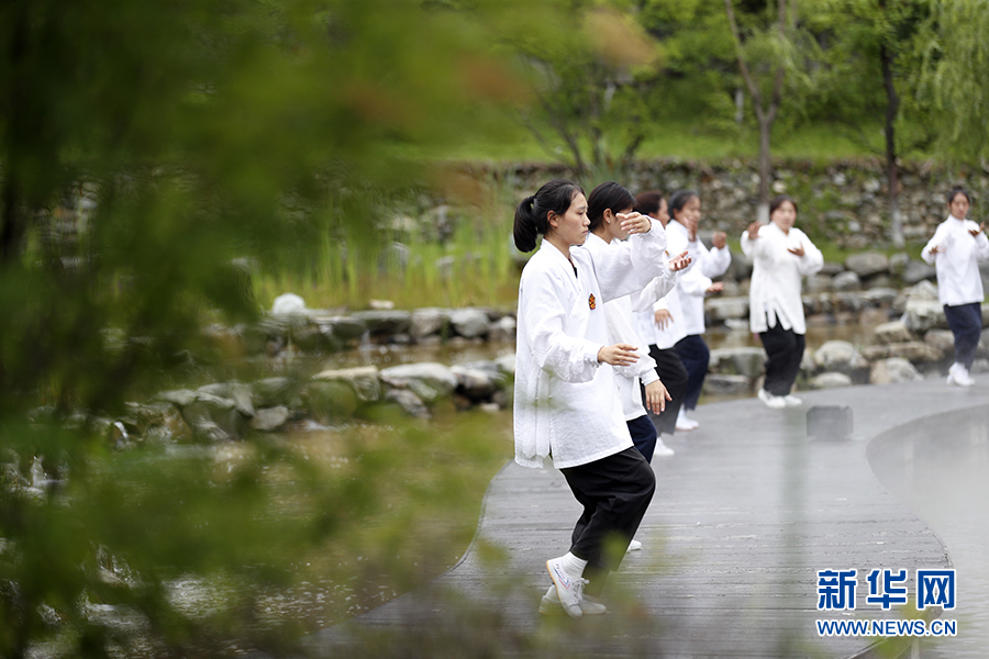 四川省九寨溝縣漳扎鎮(zhèn),幾名90后的藏族女孩在“非遺街區(qū)”研習太極拳。(7月18日攝)