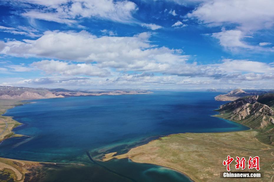 冬格措納湖位于青海省果洛藏族自治州瑪多縣,是一片地處海拔4100多米的淡水湖。夏日的冬格措納湖,湖水湛藍(lán),宛如跌落群山之中的“藍(lán)寶石”。紅、黃、綠色的草灘與湖水相互映襯,美景如畫。圖為航拍冬格措納湖美景。 馬銘言 攝