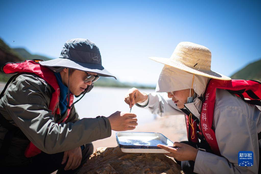 7月24日,長江科學(xué)院科考隊(duì)員劉晗(右)在瀾滄江源區(qū)的扎曲采集魚類樣本。新華社記者 肖藝九 攝