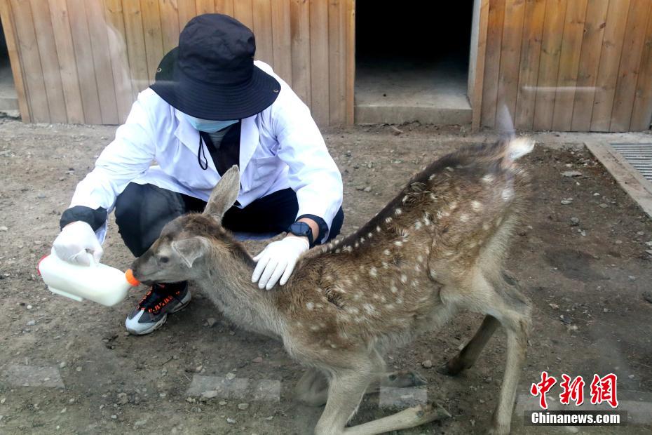 圖為“奶爸”“奶媽”給馬鹿喂奶。 張?zhí)砀?攝