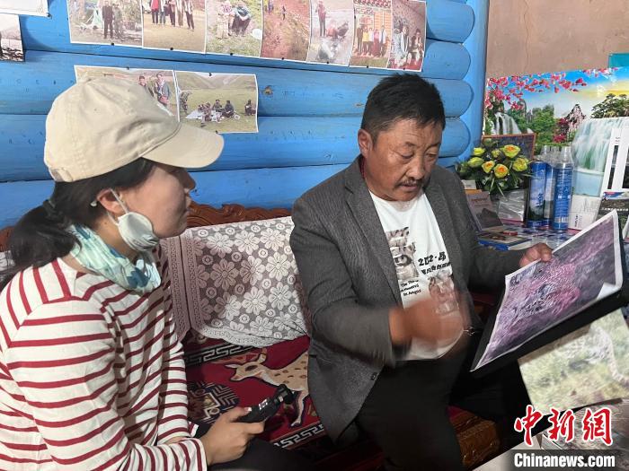 圖為義西塔生(右)向嘉賓展示拍攝到的雪豹照片。李江寧 攝
