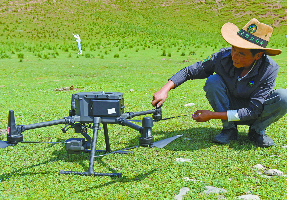 管護(hù)員開展無(wú)人機(jī)巡護(hù)前對(duì)無(wú)人機(jī)進(jìn)行檢查。