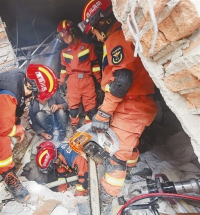 9月5日17時(shí)16分,海螺溝景區(qū)消防救援大隊(duì)對(duì)位于磨西鎮(zhèn)老街一酒店二樓的被困群眾展開(kāi)營(yíng)救。消防救援人員破拆加固建筑廢墟、安全評(píng)估現(xiàn)場(chǎng)環(huán)境,并對(duì)廢墟中的障礙物進(jìn)行清理,經(jīng)過(guò)緊張救援,被困群眾被成功救出。王明峰 劉國(guó)謙 攝影報(bào)道