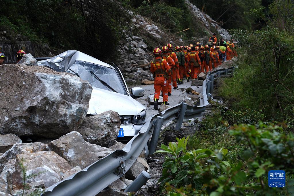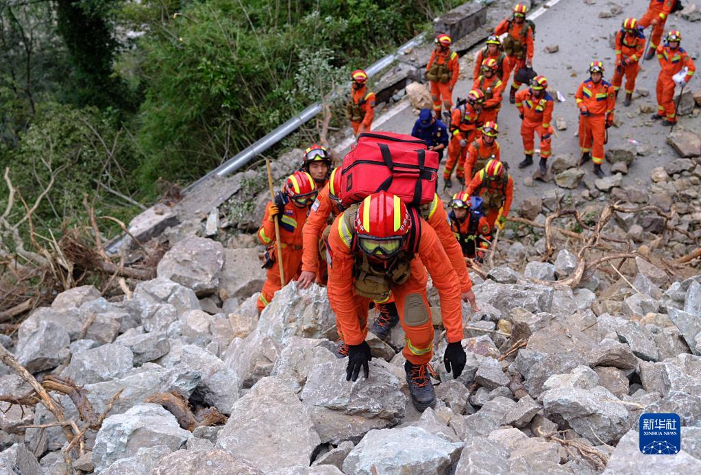 9月6日,在瀘定縣磨西鎮(zhèn)共和村,救援人員徒步進(jìn)入災(zāi)區(qū)救援。新華社 程雪力 攝