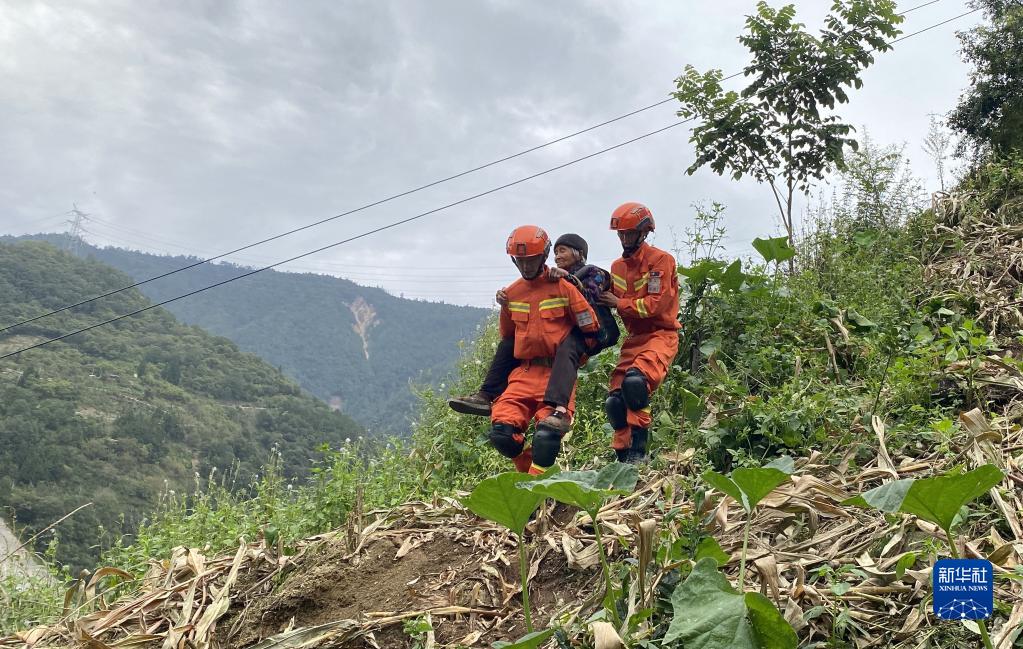 9月6日,四川森林消防總隊(duì)甘孜支隊(duì)消防員將一位老人從瀘定縣得妥鎮(zhèn)紫雅場村安全轉(zhuǎn)移出去。新華社 魏紅 攝