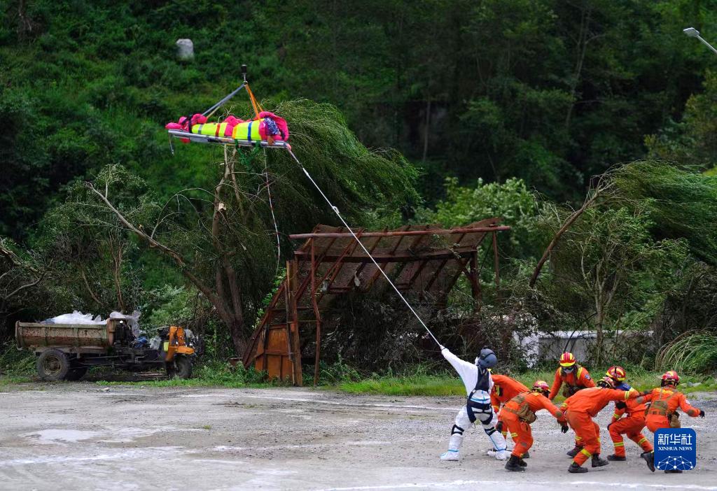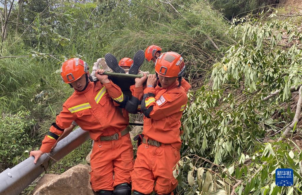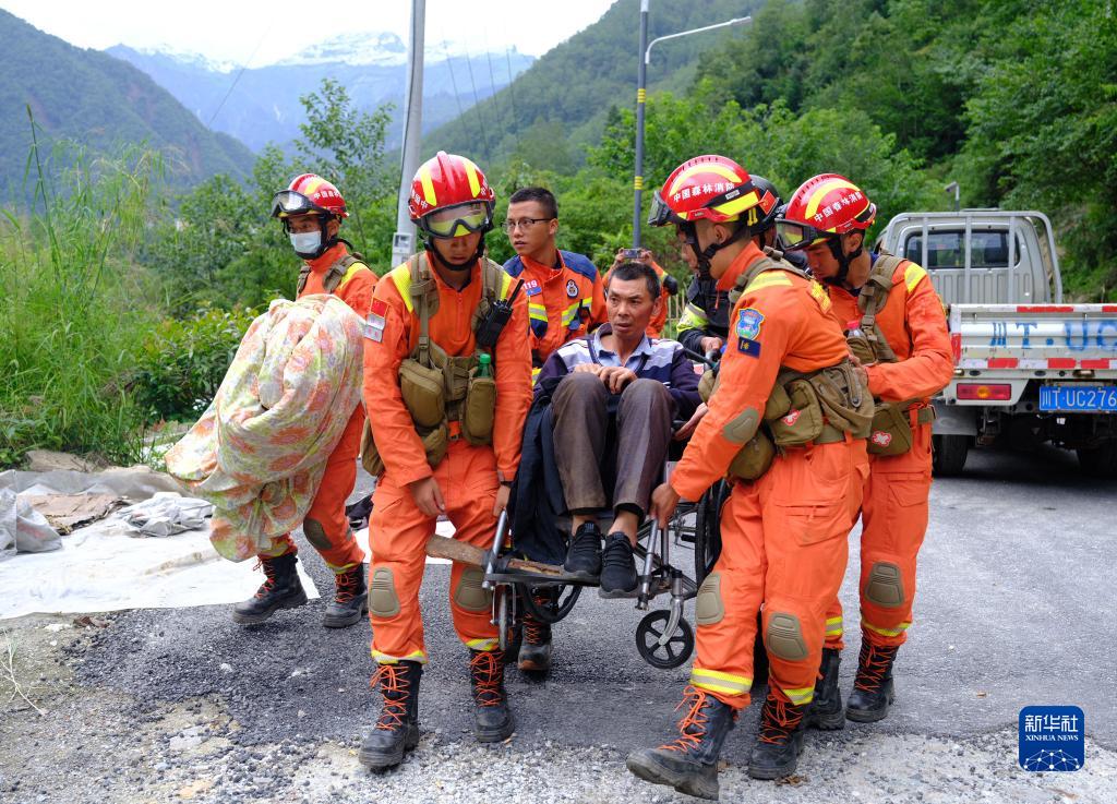 9月6日,四川森林消防總隊(duì)甘孜支隊(duì)消防員在瀘定縣得妥鎮(zhèn)紫雅場村轉(zhuǎn)運(yùn)傷員。新華社 魏紅 攝