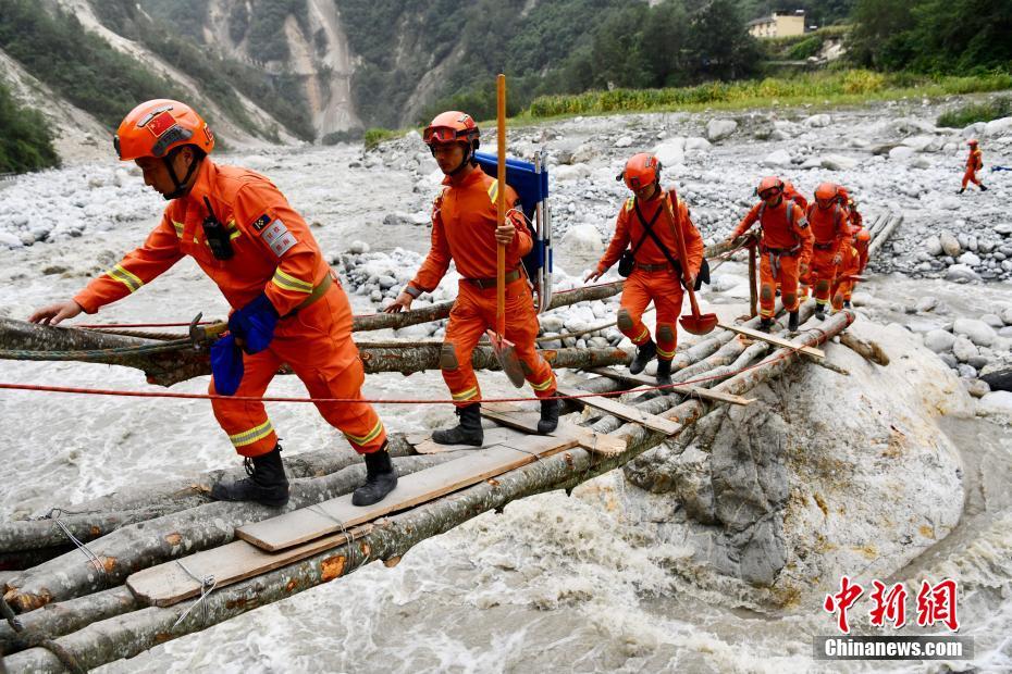 9月6日,四川甘孜州瀘定縣磨西鎮(zhèn),甘孜州森林消防支隊(duì)康定中隊(duì)隊(duì)員通過簡易木橋,深入山區(qū)開展救災(zāi)工作。9月5日,四川瀘定發(fā)生6.8級(jí)地震。 中新社記者 張浪 攝