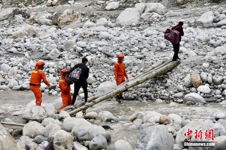 9月6日,四川甘孜州瀘定縣磨西鎮(zhèn),甘孜州森林消防支隊(duì)康定中隊(duì)隊(duì)員在木橋旁護(hù)送村民。 中新社記者 張浪 攝
