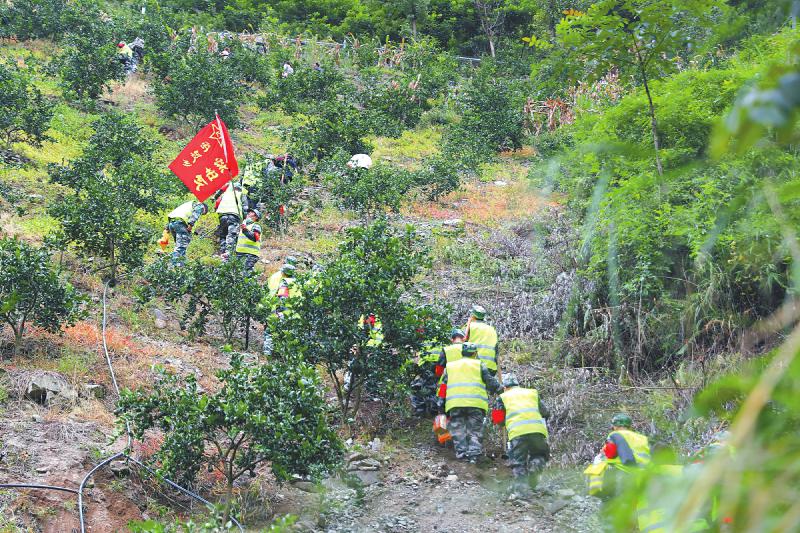 石棉縣武裝部救援小組徒步挺進(jìn)草科鄉(xiāng)。 黃剛 攝