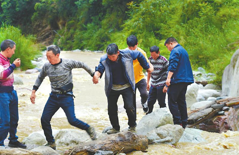 沿途有3個(gè)幾近垂直的斜坡,一行人只能緩緩下蹲、降低重心移過去。還有布滿泥沙和落石的河流,雖然有橋,但并不安全?!拔覀儞靵砟景?、樹干和石頭,搭起簡(jiǎn)易通道,才成功渡過。”李龍說。