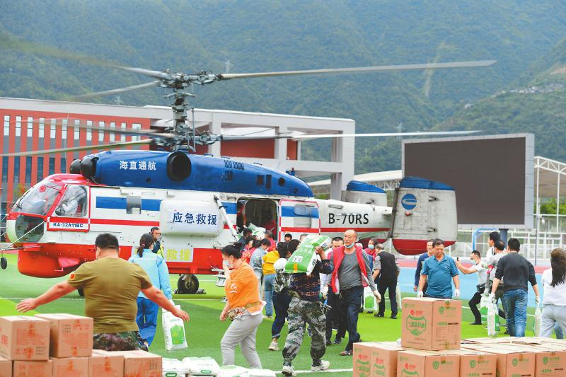 通往石棉縣草科鄉(xiāng)的空中“生命通道”——直升機(jī)運(yùn)送救援物資。 四川日?qǐng)?bào)全媒體記者 王云 攝