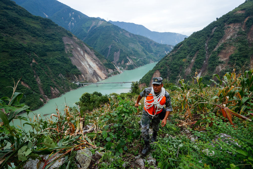 大渡河水奔涌流去,但穿梭于各個(gè)村莊間的救援人員毫無畏懼。我們隨救援人員一起坐上沖鋒舟,兩岸的山上不斷有滾石滑落。