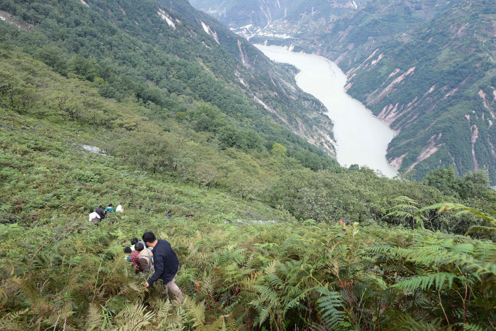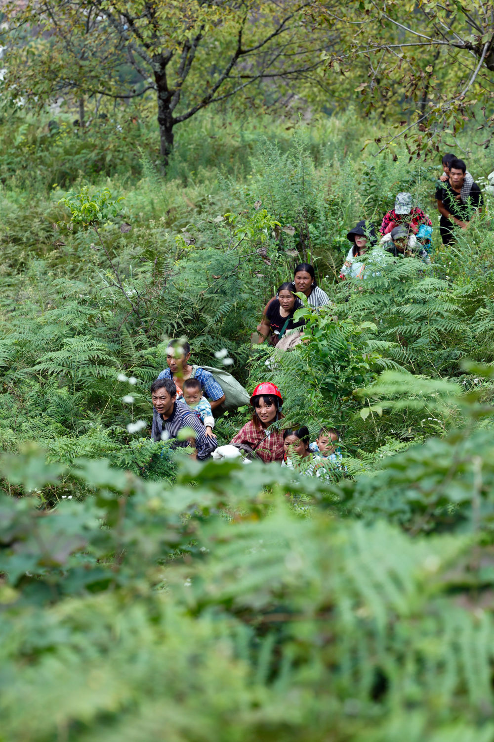 熟悉地形的村民在前帶路。其實(shí)毫無“路”可言,我和救援人員只能沿著依稀可辨的足跡向上攀爬。山高陡峻,時(shí)不時(shí)會遇到山體傾斜角度大于60度的路段,只能手腳并用才能上去。為了減輕負(fù)重,我把巧克力這樣的補(bǔ)給都放在了山下,只帶了一瓶水在身上。很快,滿頭大汗,汗水流入眼睛刺得生疼。抬頭望著遙遠(yuǎn)的需要翻越的山頭,對體力和耐性都是巨大考驗(yàn)。一些救援人員因?yàn)楣ぷ餍枰€背著很重的繩子,辛苦程度可見一斑。